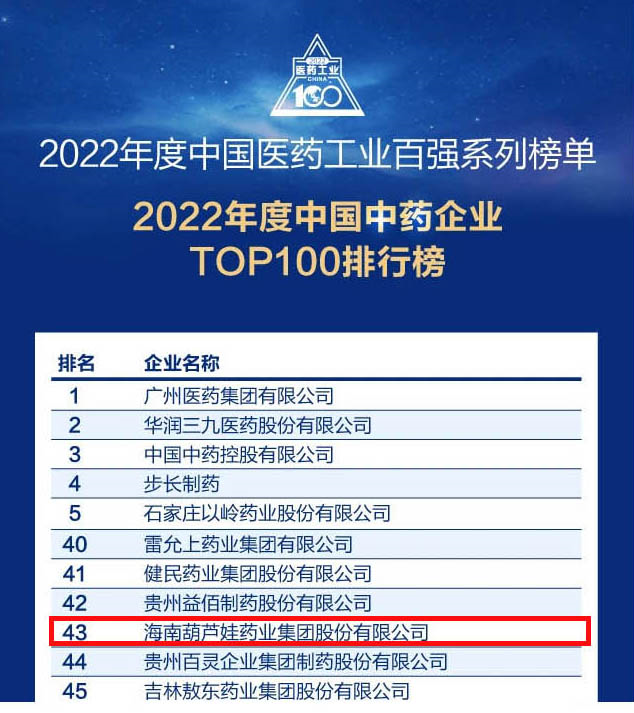会议期间,一年一度的中国医药工业百强系列榜单隆重揭晓,PG国际药业集团凭借领先的研发优势和扎实的生产实力以及稳健的市场推广能力,连续第四年成功入选“2022年度中国中药企业TOP100排行榜” ,排名稳步上升至第43位。