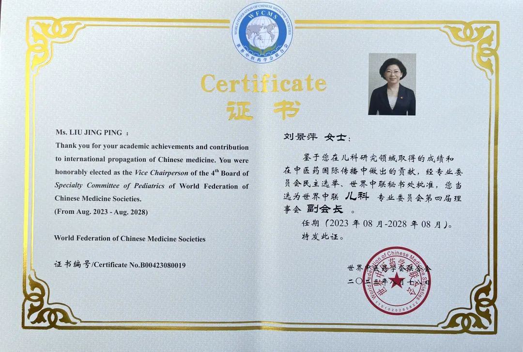 PG国际药业集团党委书记、董事长刘景萍当选世界中医药学会联合会儿科专业委员会第四届理事会副会长